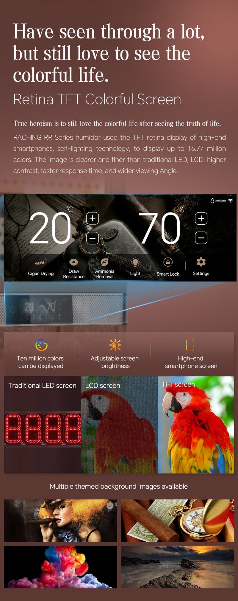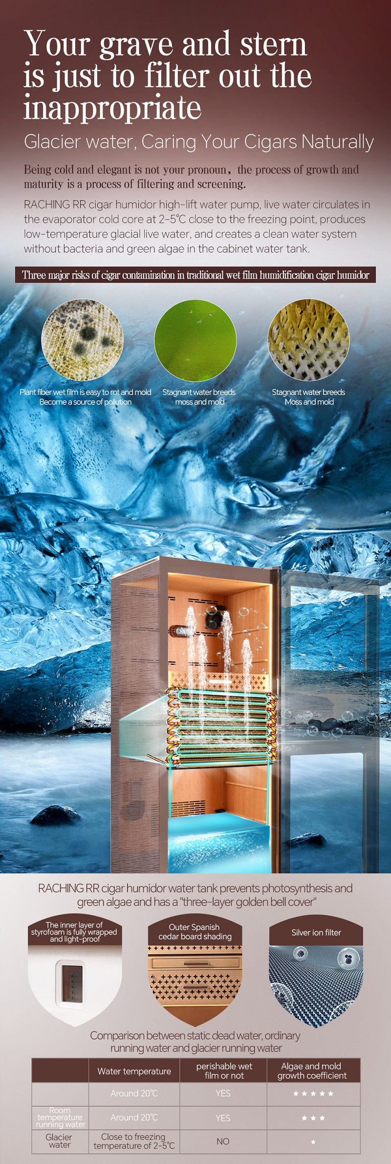 Designed as a complete climate-controlled aging system, it combines dual-core water cooling, nano-cloud humidification, advanced ammonia purification, and a fully lined Spanish cedar interior. The result is stable long-term preservation wrapped in exotic burl wood craftsmanship and modern smart technology.