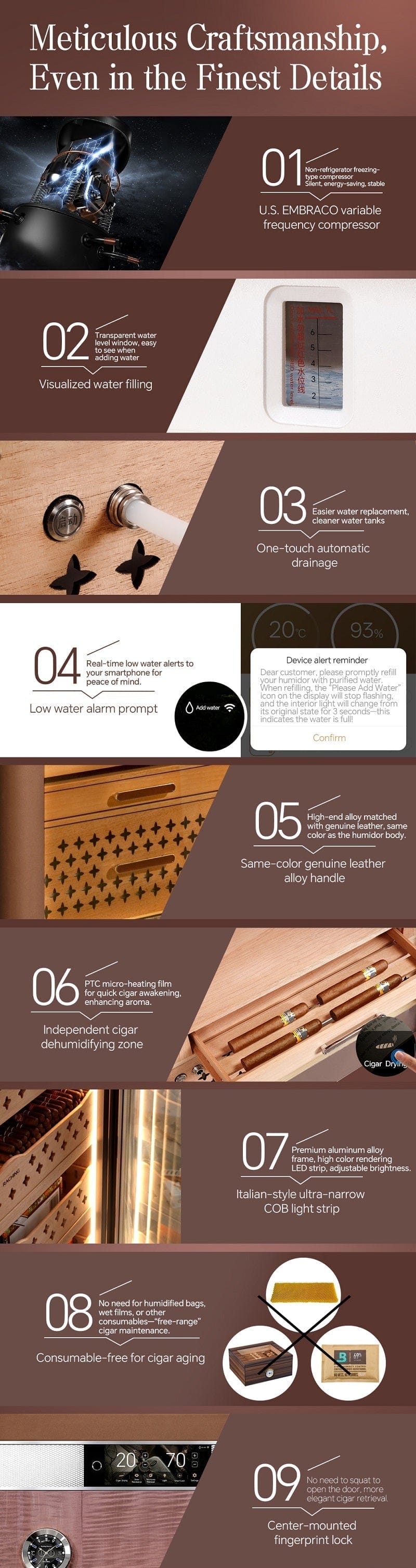 Powered by an energy-efficient Embraco inverter compressor, the system maintains steady internal conditions with minimal vibration — protecting delicate cigars from temperature fluctuations.